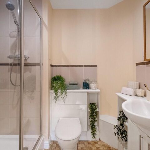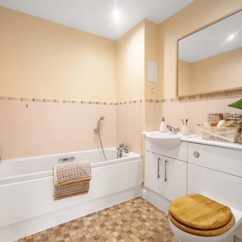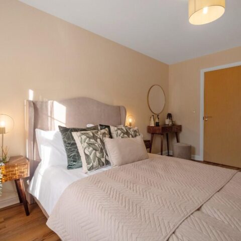 Both bedrooms are genuine doubles, an increasingly rare feature in modern apartments. Each designed to feel peaceful and well-proportioned. The principal bedroom has its own en-suite shower room, while the second sits beside a main bathroom with bath, basin and fitted storage.