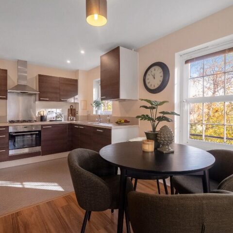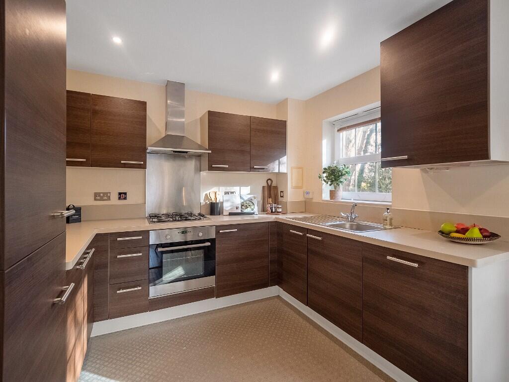 The kitchen blends practicality with understated design. Finished in dark walnut cabinetry and pale stone-style worktops, it offers generous cupboards and drawers, integrated appliances – oven, hob, dishwasher and fridge-freezer – and a well-planned layout that keeps the room tidy and uncluttered.