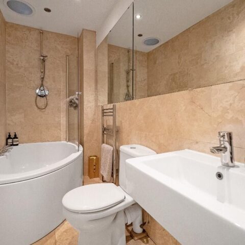 The family bathroom is calm and contemporary in style, offering a sense of order that complements the character found elsewhere in the house. Finished in neutral tones, it feels timeless rather than trend-led.