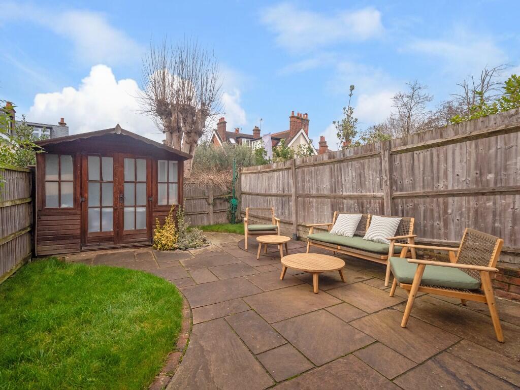 The rear garden is both practical and playful, offering layers of use that suit all ages. A paved terrace provides space for outdoor dining, while areas of lawn soften the setting and invite relaxation.